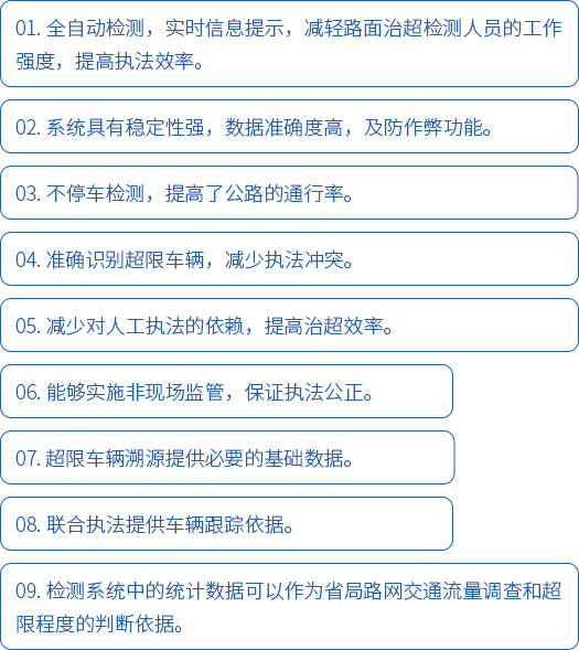 不停車超限超載檢測(cè)系統(tǒng)主要用于非現(xiàn)場(chǎng)執(zhí)法的治超系統(tǒng)將不停車動(dòng)態(tài)稱重、視頻監(jiān)控、圖像抓拍及車牌識(shí)別、信息提示系統(tǒng)等有機(jī)集成,建立起一個(gè)全天候貨運(yùn)車輛超載違法行為監(jiān)控系統(tǒng),對(duì)貨運(yùn)車輛超載行為實(shí)施有效檢測(cè)和監(jiān)控,為交通管理部門提供治超執(zhí)法依據(jù)。在車輛行駛狀態(tài)中的超限超載檢測(cè),有利于提高交通效率。系統(tǒng)的檢測(cè)數(shù)據(jù)資源可為公路行業(yè)交通量調(diào)查、路網(wǎng)監(jiān)測(cè)等管理工作提供共享信息。